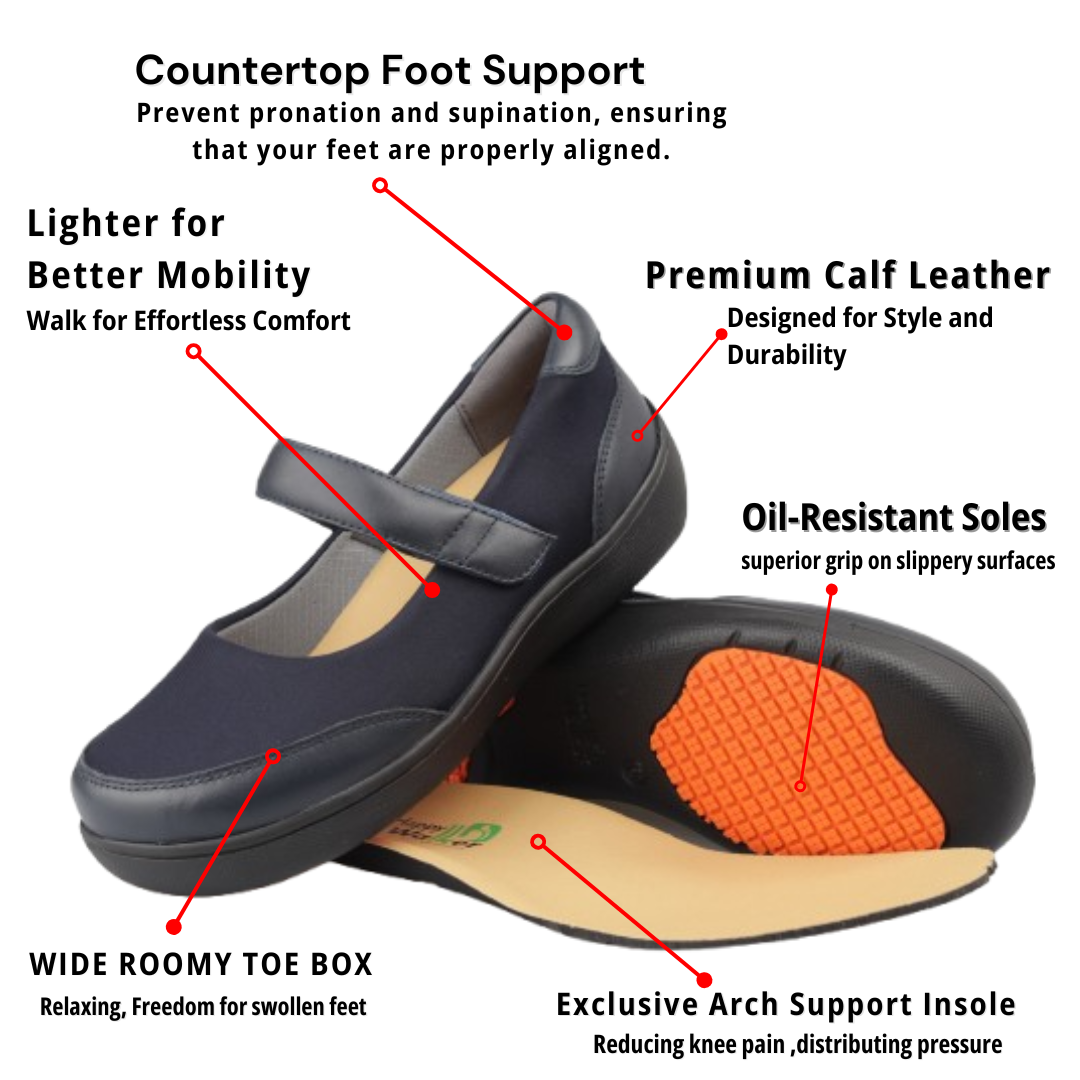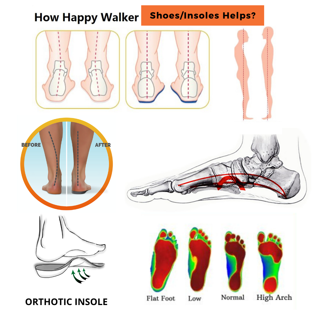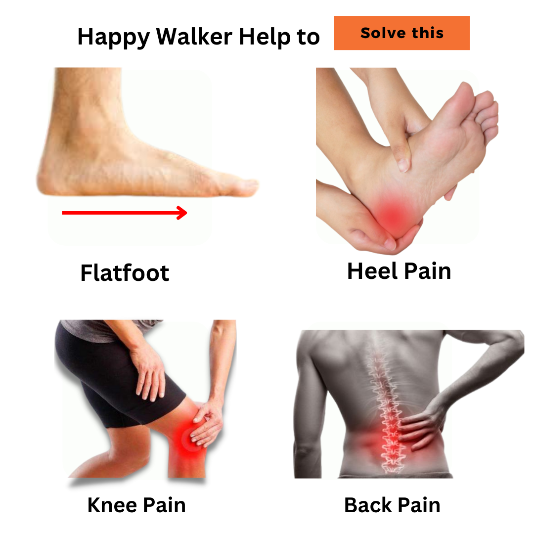 Happy Walker shoes come with **exclusive arch support insoles** that help distribute pressure evenly across your feet, reducing pain from conditions like plantar fasciitis, flat feet, and bunions. Say goodbye to sore feet after a long day!